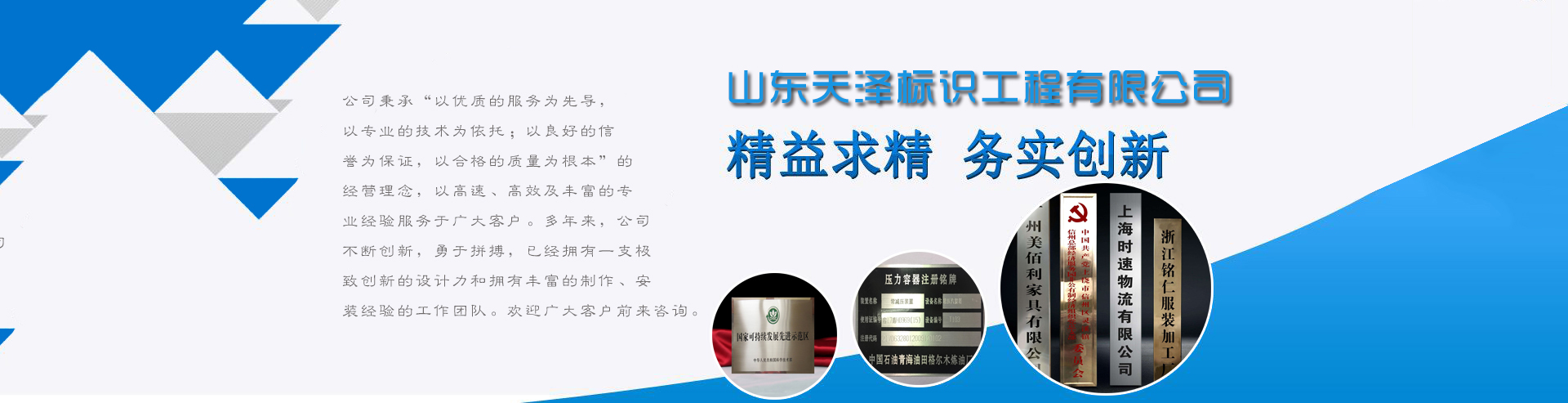 山東天澤標(biāo)識(shí)工程有限公司是一家集創(chuàng)意設(shè)計(jì),生產(chǎn)制造,安裝服務(wù),售后保障為一體的多元化公司。我們擁有先進(jìn)的設(shè)備,專業(yè)的人才,專業(yè)從事蝕刻,仿古,做舊,絲印,烤漆等工藝加工。主要生產(chǎn)機(jī)器銘牌、科室牌、樓棟牌、門牌、不銹鋼牌、銅牌、鋁牌、鈦金牌、砂金牌、授權(quán)牌、道路標(biāo)識(shí)牌及各類金屬板材的裝飾花紋,同行可代工。 我們一直秉承“以質(zhì)量、效率、服務(wù)博得客戶的滿意,以誠(chéng)信、合作雙贏求得發(fā)展”作為核心價(jià)值,立足創(chuàng)新產(chǎn)品質(zhì)量,誠(chéng)信服務(wù),真誠(chéng)合作,共同發(fā)展,是我們始終如一的追求。為客戶提供優(yōu)質(zhì)的產(chǎn)品是我們永恒的方針。我們將不斷超越自我,一如既往地為客戶創(chuàng)造價(jià)值,提供更優(yōu)質(zhì)的產(chǎn)品和服務(wù)!